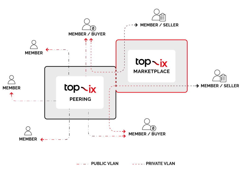 In aggiunta alla funzione base che permette l’interconnessione tra reti differenti a livello3 con il peering (1) attraverso la cosiddetta VLAN di peering pubblico, TOP-IX da sempre ha permesso sulla propria infrastruttura la vendita di IP Transit (2), attraverso la configurazione di apposite VLAN private tra le porte di due consorziati (ovvero tra il consorziato che vende l’IP Transit e colui che lo acquisisce).
